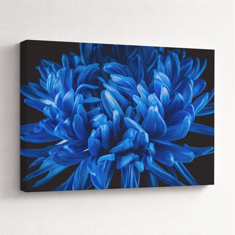 Dit canvas schilderij met bloemen geeft je interieur een koele en verfijnde sfeer. De blauwe chrysant komt door het donkere contrast extra helder en krachtig tot leven en zorgt voor een rustige, moderne uitstraling die goed past bij een stijlvolle en minimalistische inrichting.